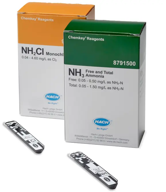Ammonia, free 0.05 – 0.5 mg/L NH3-N / total 0.05 – 1.50 mg/L NH3-N, and Monochloramine, 0.04 – 4.0 mg/L Cl2, Chemkeys. For SL1000 Portable Parallel Analyzer (PPA).