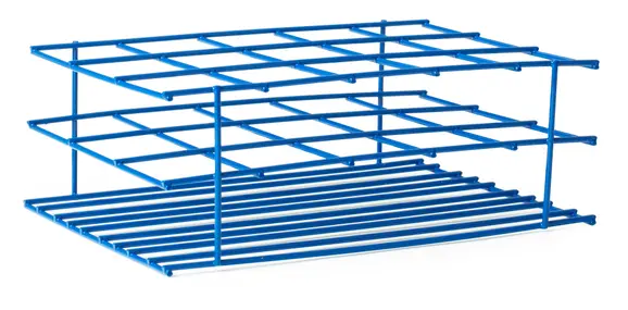 Made in the U.S.A. of 10 and 12-gauge steel fused together to create strong joints and straight lines. Rack is finished with an electrostatically applied powder coating. The result is a strong, durable finish which will stand up to many laboratory materials and the rack can be autoclaved. Max dry temperature is 300°F (148°C) and wet temperature is 500°F (260°C). Dimensions listed above are approximate. Compartments fit most bottles associated with standard drinking water sampling. 15 compartment rack is ideal for Whirl-Pak® sample bags (4 oz).
