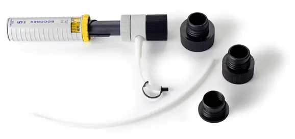 Wheaton Variable Volume Bottle-Top Dispensers screw directly onto reagent bottles to deliver solution volumes within tightest tolerances. Fixed selector steps permanently calibrated at factory. Manufactured to provide inert fluid path to withstand acids, bases, and organic solvents. PTFE coating prevents plunger from freezing when alkaline solutions are dispensed. Dispenser can be autoclaved at 121°C. Fits reservoirs with 33mm screw neck finish. Bottle neck adapters provided for 28, 38, and 45mm bottle neck finishes.