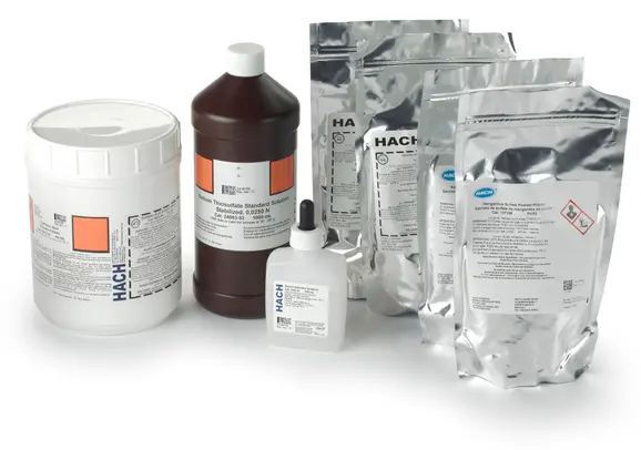 For determination of Dissolved Oxygen by the Winkler Method (Azide Modification) and buret titration. Range: up to 10 mg/L as DO. Sample Size: 300-mL. Contains reagents for 100 tests.
