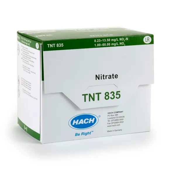 For determination of Nitrate Nitrogen by the Dimethylphenol Method in wastewater, drinking water, surface water and process waters. TNT835 nitrate reagents have a reporting range of 0.23 to 13.50 mg/L NO3–N or 1.00 to 60.00 mg/L NO3.