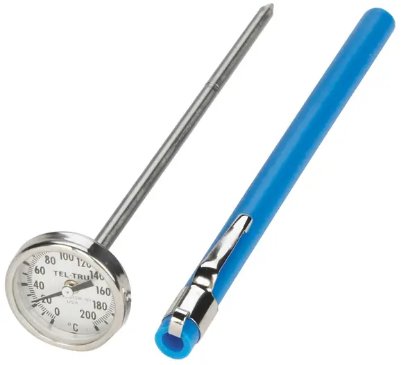 Bi-metallic. Dial gauge 0 to 200°C ±1%. Two degree divisions. Probe diameter is .15 inches. Plastic carry case with clip.