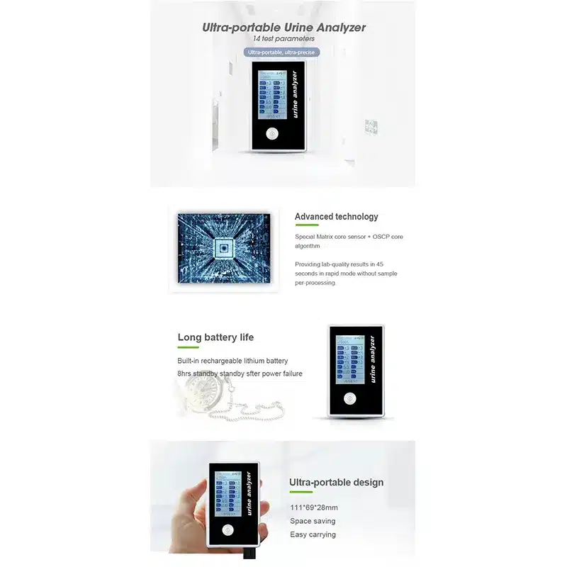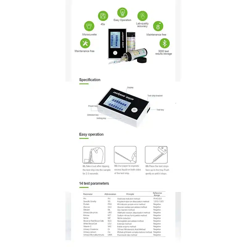 Urine analyzer is used in medical institutions for semi-quantitative detection of biochemical composition in human urine samples through analysis of the matched test strip. Urinalysis includes the following items: leucocytes (LEU), nitrite (NIT), urobilinogen (UBG), protein (PRO), potential of hydrogen (pH), blood (BLD), specific gravity (SG), ketones (KET), bilirubine (BIL), glucose (GLU), vitamin C (VC), calcium (Ca), creatinine (Cr) and microalbumin (MA). Product features:Small and exquisite with stylish design and easy to carry. Easy operation, measurement completing by pressing one button. Built-in 1200mA rechargeable lithium battery can support you to finish the detection at anytime. Bluetooth Transmission is supported. Compatible with urine test strips of 1 to 14 test items. Detachable test strips holder, easy to clean and reduce pollution.